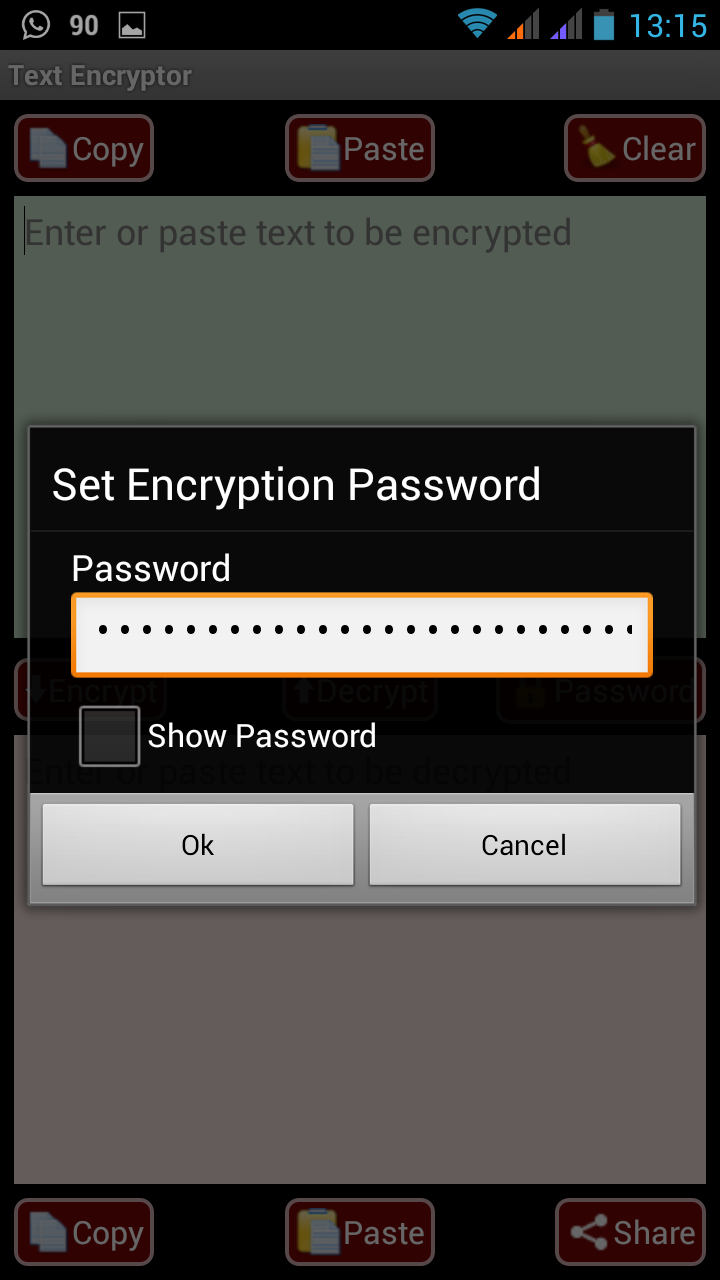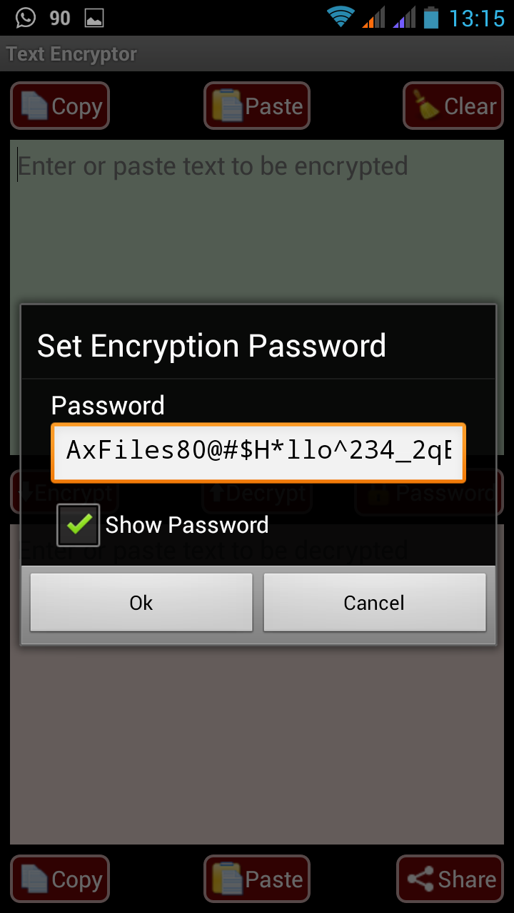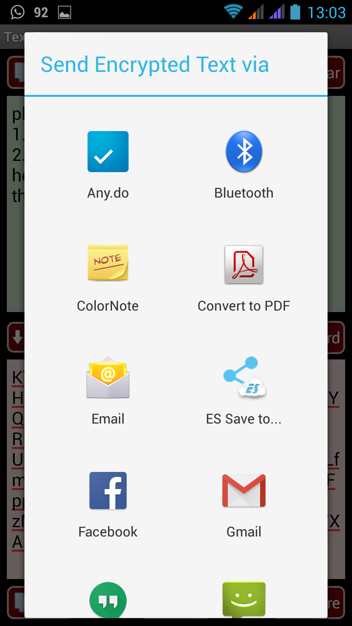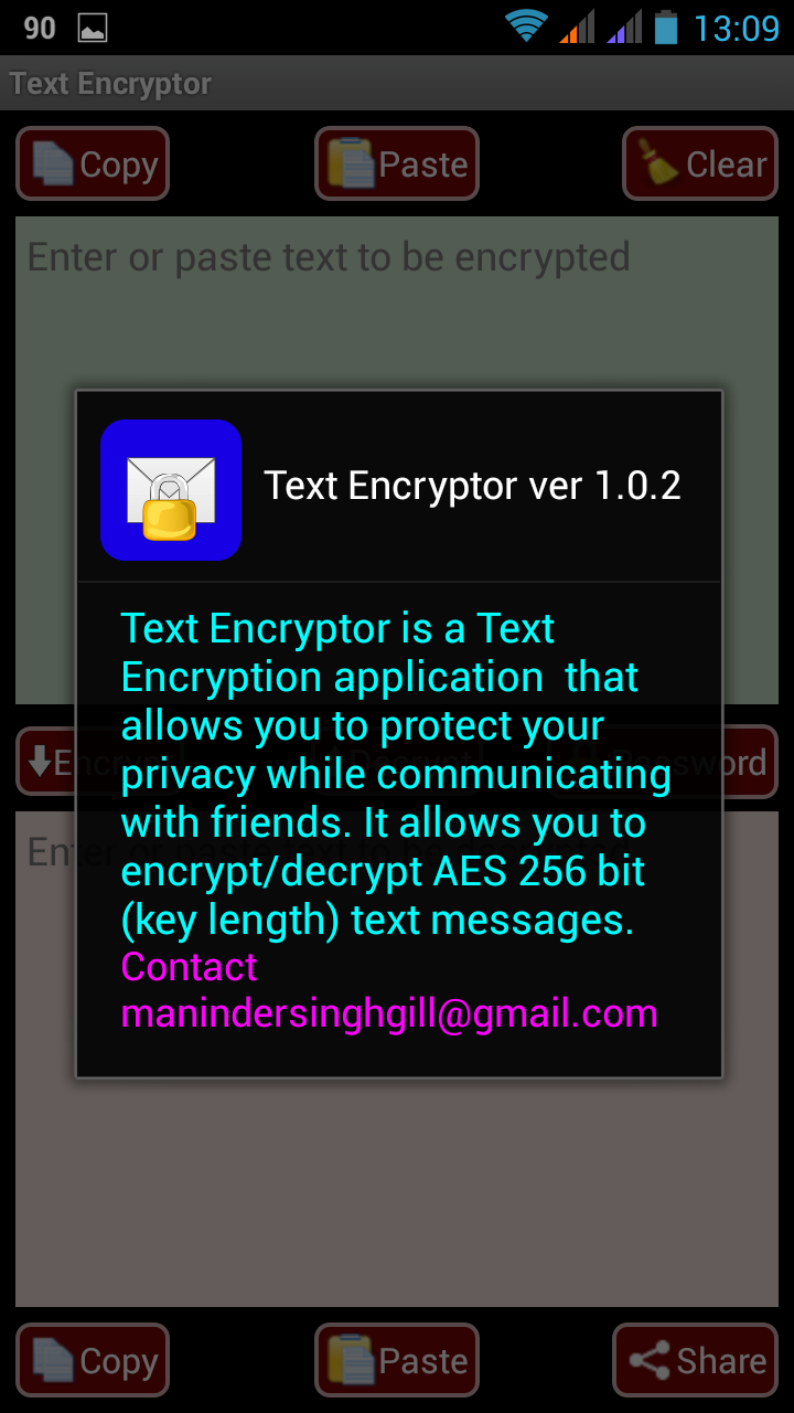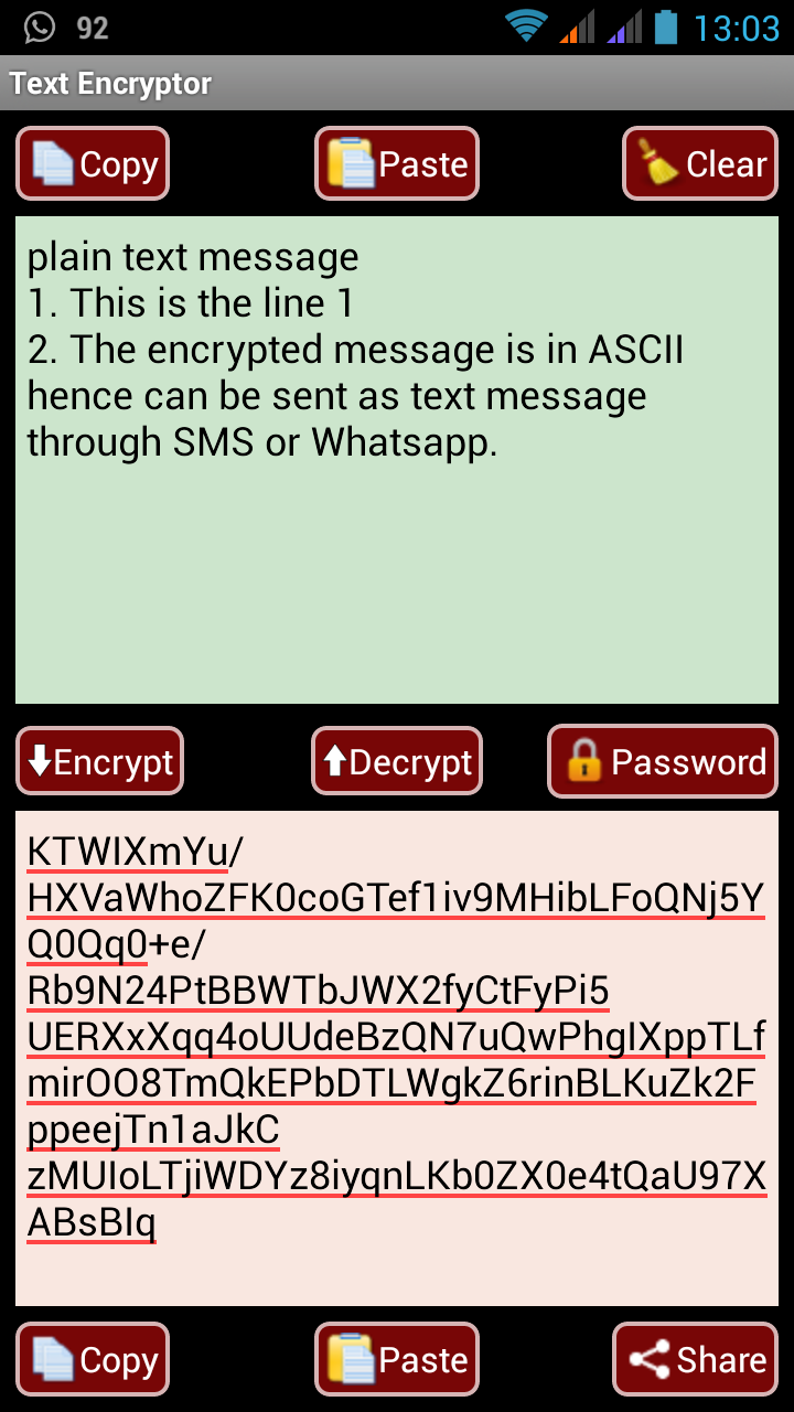 If you have to share the encrypted text, you can do so from your mobile through WhatsApp, SMS, email etc. The text can be decrypted at the other end through the same app and by applying the same password as you used to encrypt the text. A password ensures double security. The best combination would be to send your message through one means of sharing and the password through another.