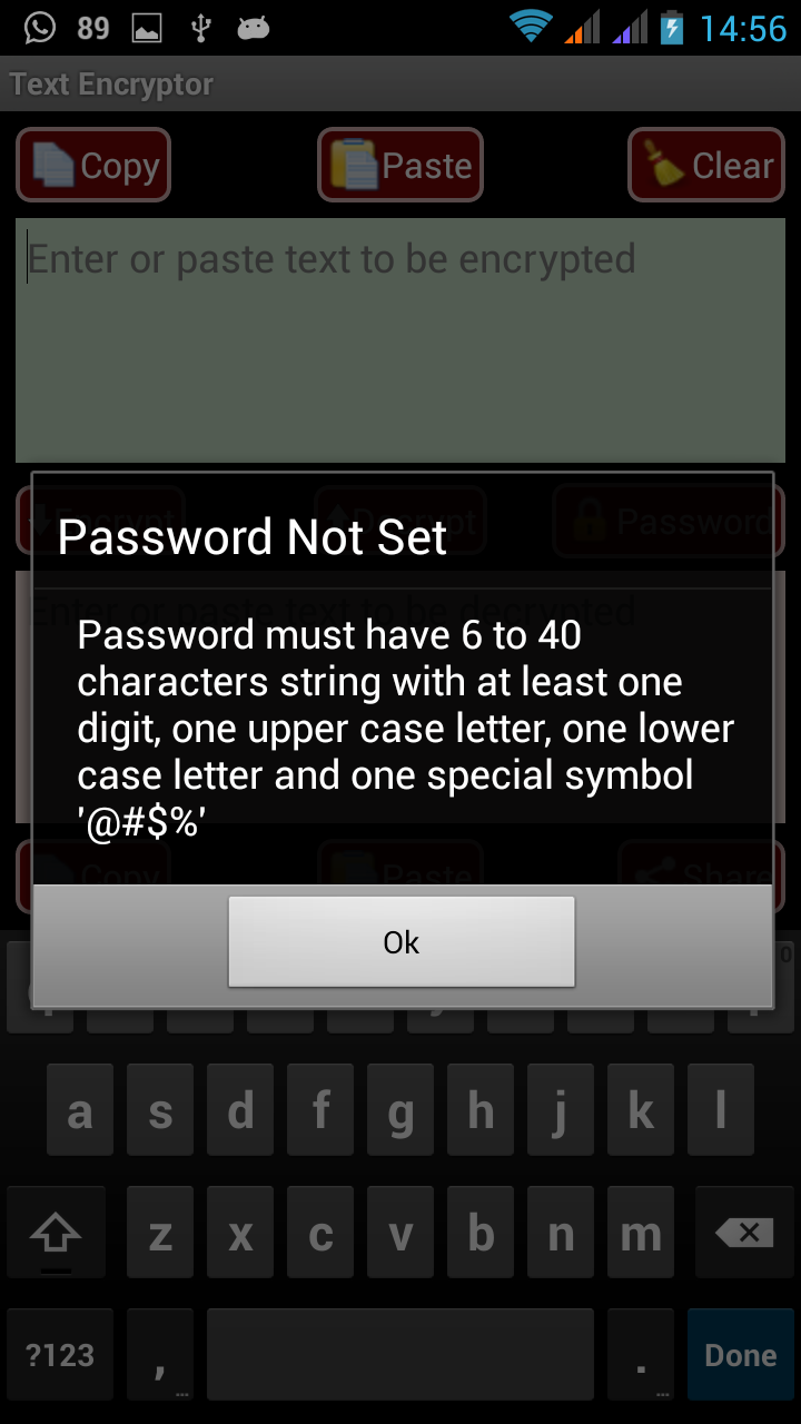 You can then secure this encrypted message with a password. The password should be at least 6 chars long with at least one of each a digit, an uppercase letter, a lower case letter and a symbol from @#$%.