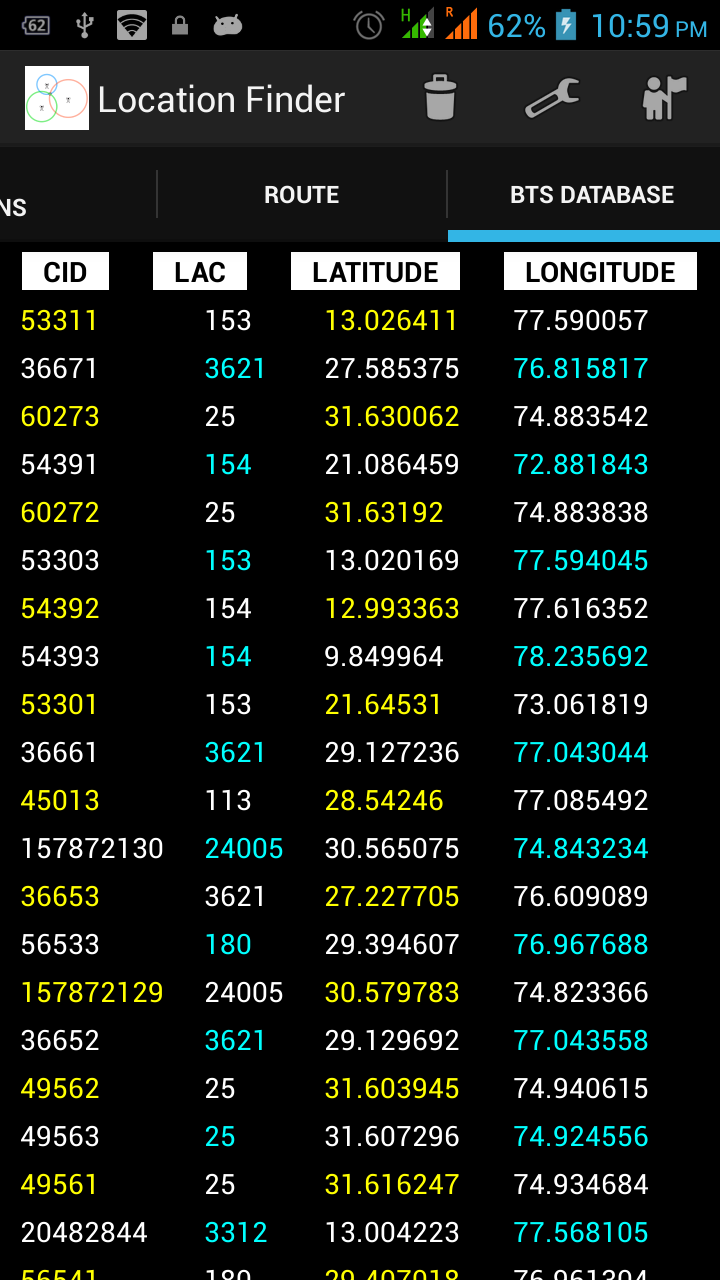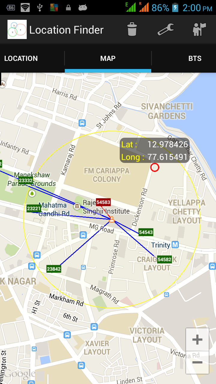 Known issues: The google data base is not complete and correct.When I say not complete, is that for all BTSs , google does not have location coordinates. I plan to give user an option to switch on his GPS and capture the missing data and use that as the location coordinates for those active BTS. Users can suggest any other options in the comments section below. When I say not correct, I mean for certain CID and LAC values the Latitude and Longitude values returned by google are not correct. For example, for a BSNL(GSM Service provider in India) BTS having a CID 28591 and LAC 128 located in Bangalore,Karnataka,India the location coordinates given by Google are for Gandhinagar,Gujarat,India. This is more clear when you see the BTSs from your local sqlite database plotted on a map in the BTS fragment. I am working on it. I am planning to have a option using which one can blacklist such records in the local sqlite database. Users can suggest any other options in the comments section below.
