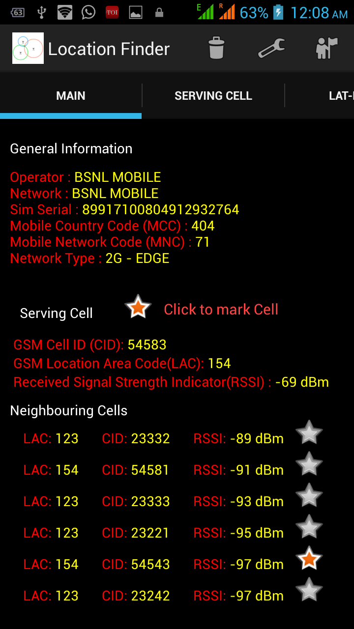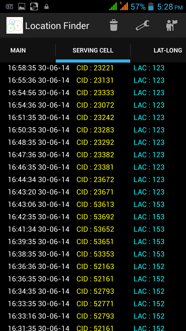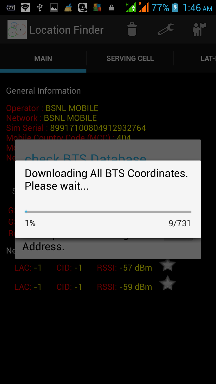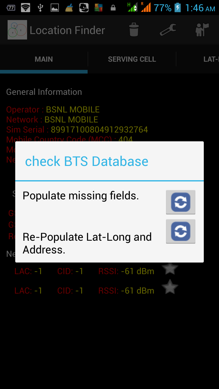 Now a situation may arise that when using the app that you don't have access to Internet. In that case the app just records the Cell-id and LAC value for the BTS. The corresponding values of location and address for the BTS can be fetched later from Google database using the first option ie Populate missing fields.