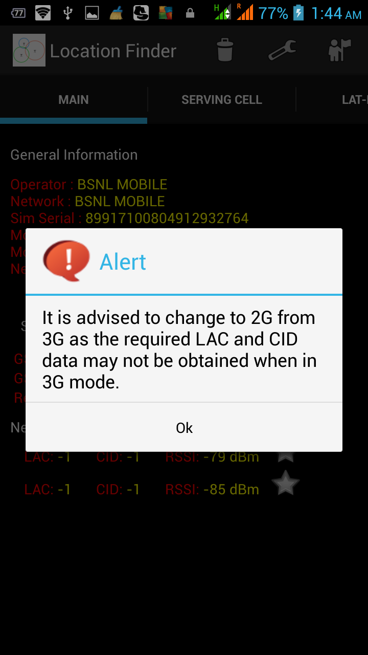 Now coming to the app proper, it consists of the certain fragments which are explained below. This is followed by some usage scenario in which this app can be used effectively. Note that, it is advised to change to 2G from 3G as the required LAC and CID data may not be obtained when in 3G mode. On startup you would get an alert as shown below regarding the same.
