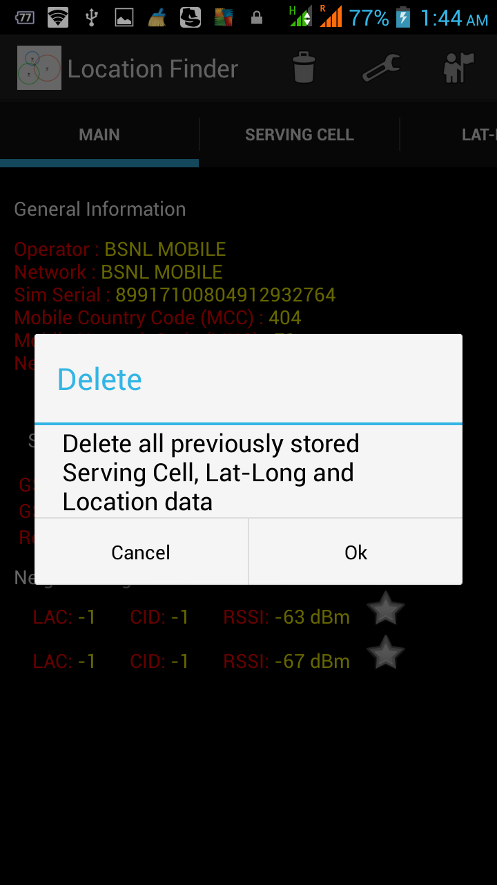 3.a Delete We keep a record of all the previous Cell ID, their location coordinates and corresponding address.These records can be deleted using this submenu.It is recommended to clear the history often as a large history takes time to render when changing fragments.