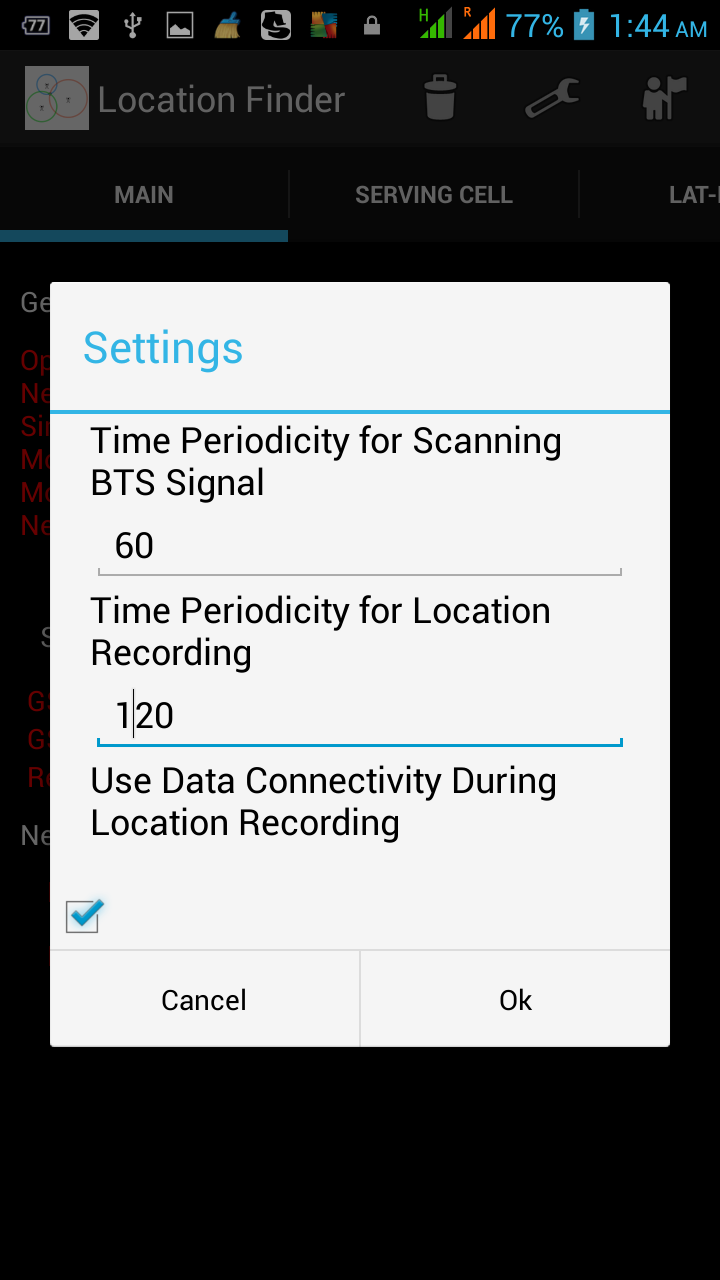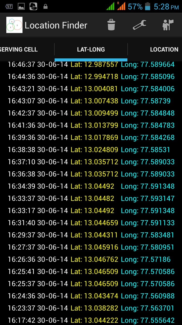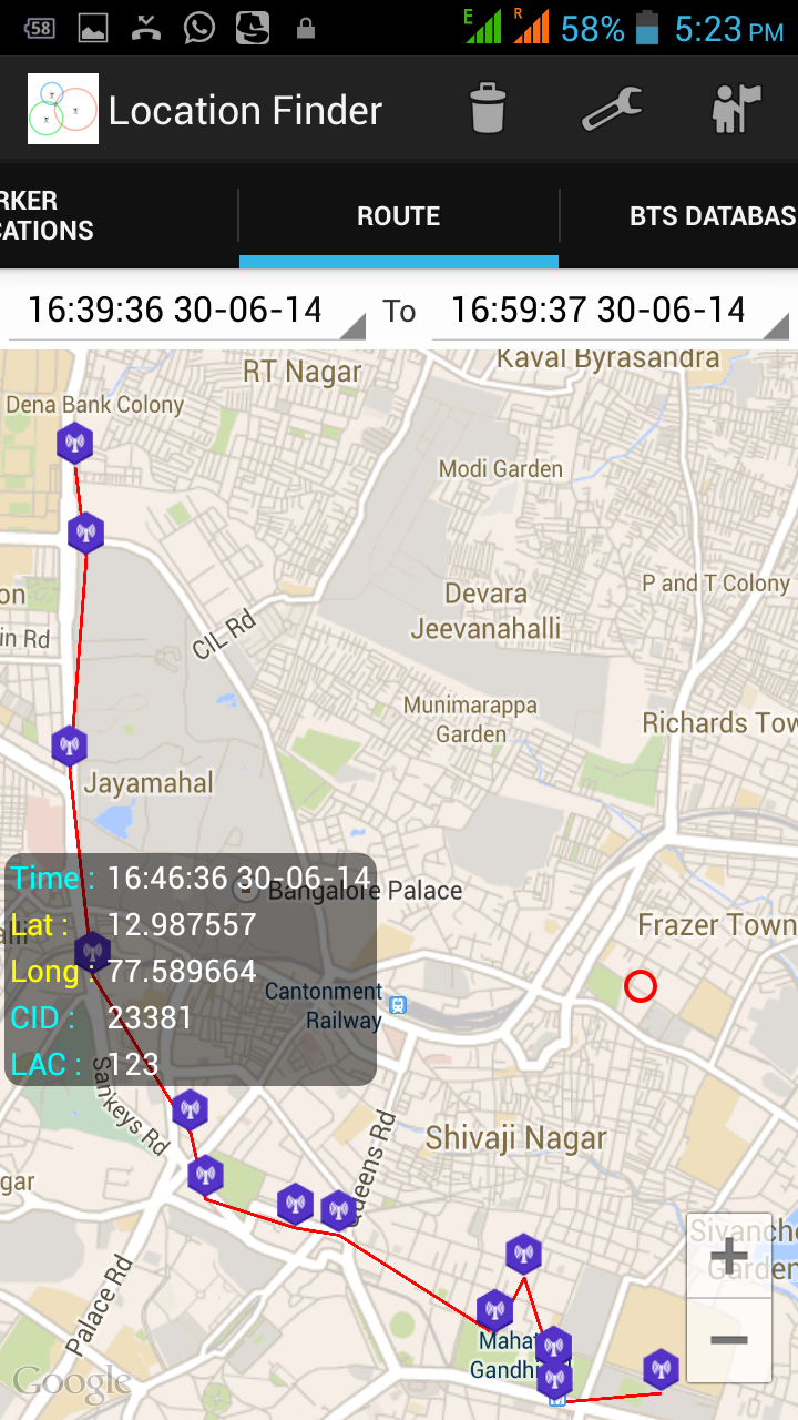 The idea here is to record the approximate location of your phone over a period of time using minimal amount of battery life .So we are making an approximation and taking the location of active BTS as your location. This location is recorded at regular time intervals, the time interval can be set by going to the preferences in the menu option. Further, one may not want to use the data connection while recording the location to save on battery/data usage. To avail this option, disable use of data connection during recording by going to the preferences in the menu option. However, to display the route taken one needs to get the lat-long corresponding to the CID-LAC values of the recorded cells. For this , when you select the route tab, that is the time when the app using your data connection would find the location coordinates for the recorded cells in the sqlite database.