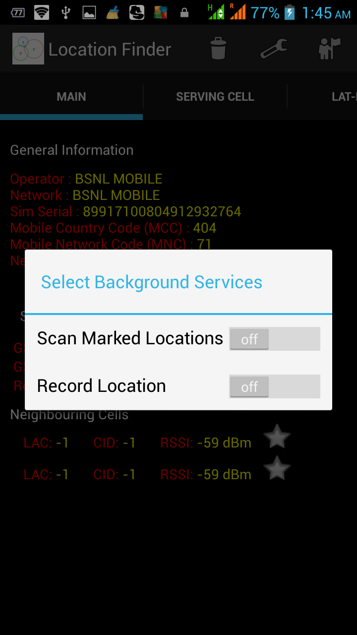 3.c Services Using this option one can start the background scanner for BTS signals or start a background service to record location based on active cell. Note that when you start either of the above services, we need to scan the air for the GSM signals. Now in Android when you phone is in sleep mode, the api when invoked by the user application will not give the required result. The OS has been designed such. Therefore, we need to bring the phone out of the sleep mode temporarily and again put it back to sleep. And in that time duration scan for the air waves.So you would see your phone come out of sleep mode(something which happens when you press the power button) exactly at the desired time interval ( selected in menu option above) and go back back to sleep within a second. Therefore, one can just lock the phone and yet it would alert/record location based on the mode selected.