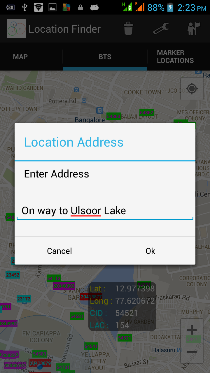 . The active cell is displayed by a text box having red background and connected to present location using a red line. Neighbouring Cells is displayed using a text box having a green background and connected to present location by a blue line. Those cells which are not connected to present location but are being displayed with either a green background on the google map are the ones which were either active/neighbouring cells in the past. On long pressing anywhere on the map, the area would be marked using a circle with red circumference and it location would be displayed as a popup . On clicking any active/neighbouring cell its details are displayed which include its latitude,longitude,CID and LAC. On clicking the popup an address window would appear and the BTS would be marked with the address entered. As one moves, the handoffs can be seen in this fragment.