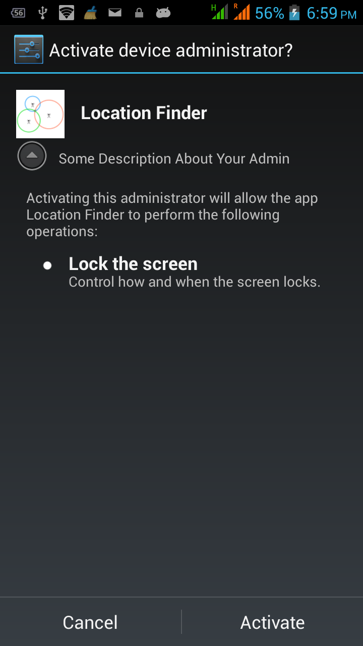 Incase you press cancel on the above screen , the app would not be able to lock the screen and would not function properly. However, you can activate/deactivate Device Administrator feature for the app by going to the Settings -> Security - > Device administrators as shown below.